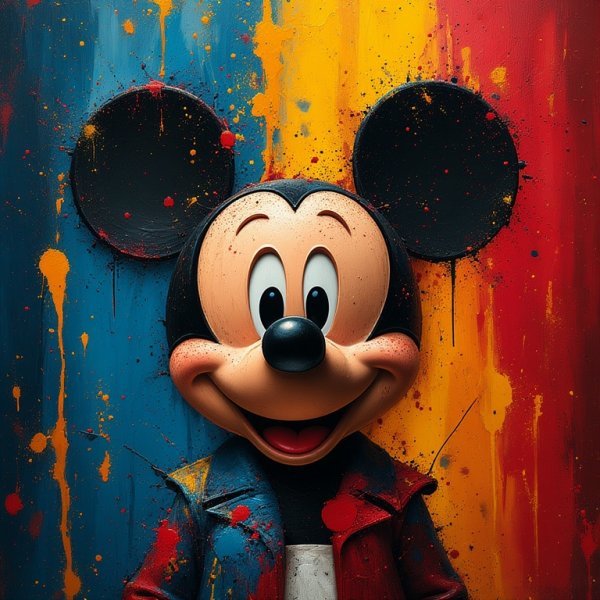 This painting utilizes high-resolution techniques to render an abstract depiction of a famous pop culture icon, inspired by Pollock's artistic style. Created in 2025, the work features layered textures and grunge details reminiscent of vintage and retro aesthetics, enhancing its graphic and decorative appeal. The piece challenges traditional copyright norms through its innovative fusion of pop imagery and modern abstract expression.
