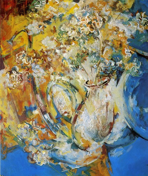 The picture is written in an expressive style, it displays a festive still life in dark red, warm yellow and blue cool shades.