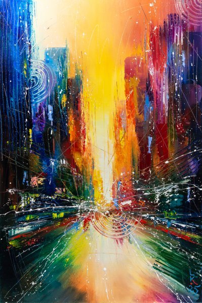 This painting captures the enigmatic awakening of urban life, where light courses like energy through the city's veins. The vibrant colors and abstract forms portray the tension between silence and movement, reflecting the pulse of modern existence. The contrast of shadow and radiance symbolizes inner renewal and emotional awakening, inviting viewers to experience the transformative power of a new day in the heart of the city.