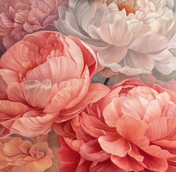This painting is a visual metaphor for tenderness and inner strength. Lush peonies, revealed in a complex play of coral pink and milky white shades, create a feeling of depth, light and air. Translucent layers of paint and soft tonal transitions give the flowers an almost bodily presence - they seem to breathe and radiate peace. The work balances between photorealistic accuracy and emotional poetics, inviting the viewer to quiet, intimate contemplation. "Sensual Pinks" fill the space with warmth, elegance and harmony, becoming a sophisticated accent of a modern interior or a collectible work