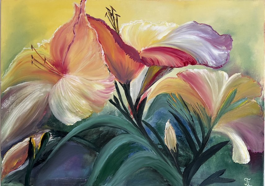 Enchanted Symphony of Lilies On the yellow-green canvas of nature, delicate lily flowers have blossomed, like bright lanterns in the forest twilight. Their petals, sparkling with all shades of white and pink, rise to the sky, like hands begging for help from the sun. The wind whispers its secrets to them, and they sway to the beat of its melody, filling the air with their sweet aroma. These are not just flowers - this is music frozen in colors and shapes, a symphony that can only be heard with the heart.