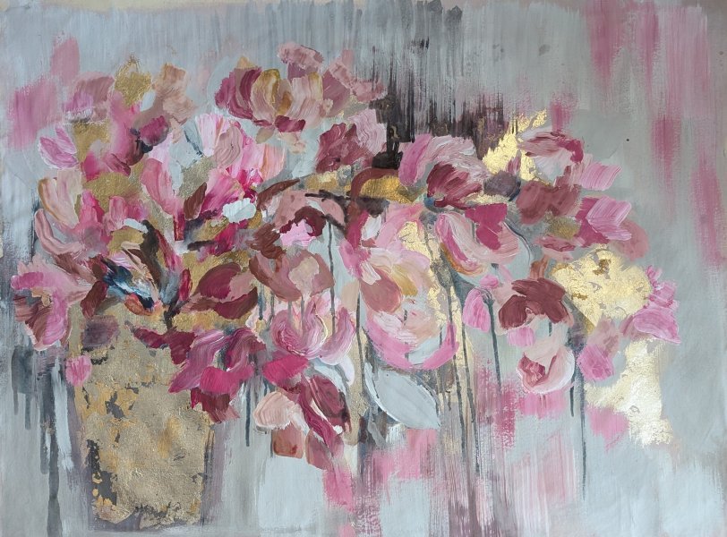 This painting captures the fragile beauty of soft pink petals, evoking a sense of tenderness and emotional depth. The gentle interplay of white and greyish-pink tones creates a mood of lightness and vulnerability, inviting viewers to immerse in the quiet sensitivity of the moment. The subtle trembling effect portrayed through delicate brushstrokes adds life to the flowers, highlighting the poetic nature of fleeting emotions and the quiet grace found in natural softness.