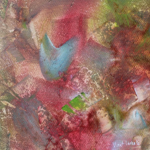 This abstract work captures a warm essence through its use of muted and vibrant colors. The overlapping layers burst with grunge hues, creating an intimate and comforting atmosphere. Artist Vinet-Larente plays with tones and textures to evoke a sense of emotional depth, while remaining true to contemporary and vintage aesthetics. Through the richness of colors, this piece invites the viewer to delve into an inner artistic journey.