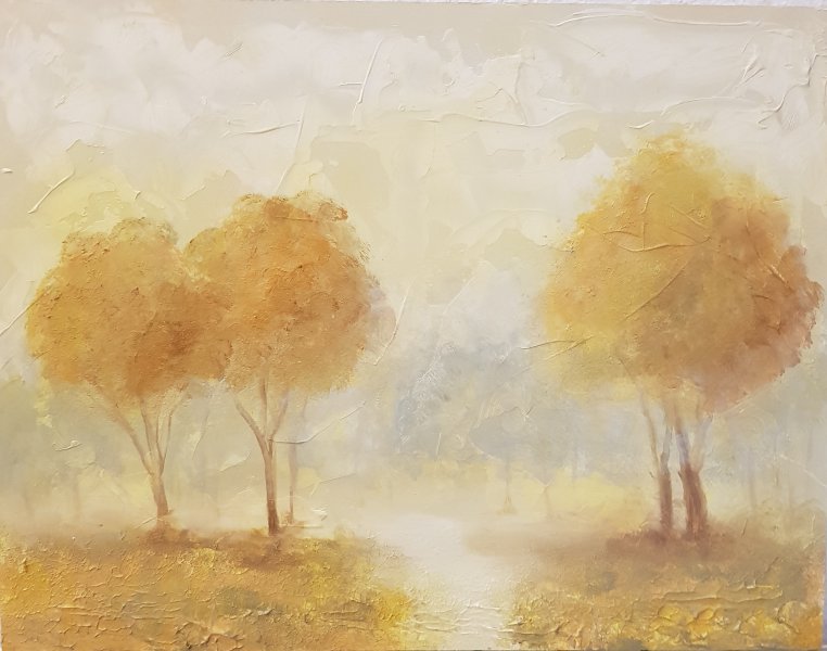 This oil painting on canvas uses overlapping layers of color to create remarkable depth and rich texture. The palette comprises ochre, honey, and amber tones, evoking the first light of dawn. The composition features a misty effect that envelops the landscape, highlighting the golden details of the treetops. The oil paint ensures a vibrant and long-lasting finish, signed by Mercedes Gordo in 2025.