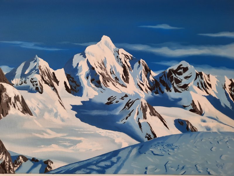This painting masterfully conveys the calm and grandeur of the winter mountains. The bright play of light and shadow is reflected on the snow-capped peaks and glacier, creating an atmosphere of silence and peace. The sky with light clouds adds airiness to the composition, emphasizing the height and scale of the mountain landscape. This work awakens a sense of unity with nature and a desire to travel through the winter expanses.