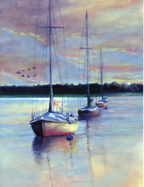 Holiday Harbour is a calming image of three sailing boats in harbour - their masts symbolic crosses against the skyline - the sea iridescent and calm. The clouds fluffy and light against the darker background. Birds fly in unison in the sky in a less than maths symbol heightening the surreal emotion that puzzles over the unknown. Calm and serene with a delicate blend of colour the image evokes a still calmness and peacefulness. The soft colours guides the eye to the distance, highlighting the nauances both of the journey and the stillness of water. This A3 original oil will come in an Italian black and gold wood vermeer frame.