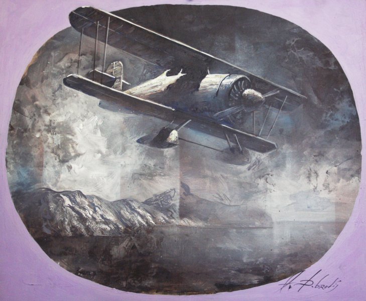 The painting creates a dramatic and tense atmosphere, a sense of man and technology intertwining with the elements. Deep blue and turquoise components of the water and clouds predominate, contrasting with white splashes of foam and the warm orange-brown tones of the aircraft. The painting is painted on synthetic panel with standard acrylic paints. It must be framed.