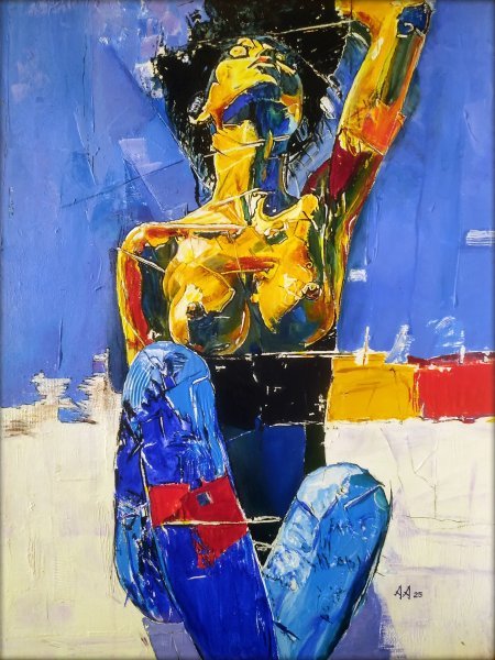 Professional artist from Ukraine, now working in Kyiv. His first solo exhibition took place in 1979, featuring a series of stained glass windows at a student club. Since then, he has participated in numerous group exhibitions, competitions, and is represented in both permanent and solo expositions. Aksyonov’s creative interests extend beyond painting to invention, music, choreography, sports. In 2017, he became the Ukrainian ballroom dancing champion. He believes the theme of dance is underrepresented in visual art, which inspires him to explore it in his work. His paintings often center on women—dancers who embody love, expectation, passion, and the fragile beauty of life’s fleeting moments. Through expressionist collages of color and form, he reflects the emotions evoked by feminine grace. His works invite viewers to rediscover joy, hope, and faith in creation through the luminous energy of movement and the beauty of the human spirit.