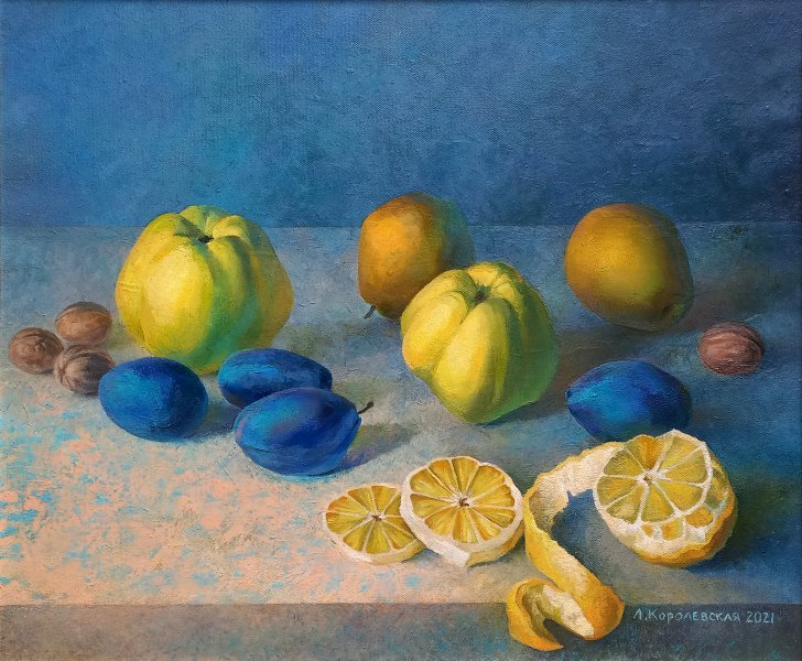 The autumn rays of the setting sun illuminate the fruits scattered on the table softly. The play of light allows you to feel the juiciness of the fruit. The colors of ripe fruits: plums, pears, quince, lemon – set off each other, emphasizing their beauty.