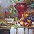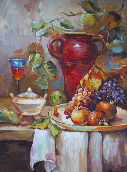 This painting captures a lively tableau of vessels arranged to evoke the warmth of holiday and gathering. The impressionistic style brings soft edges and vibrant hues to everyday objects, transforming a simple still-life into a joyful celebration of food, decoration, and conviviality. The gentle interaction of light and shadow on glass and ceramic enhances the festive mood, inviting viewers to appreciate the beauty in ordinary moments shared around the table.