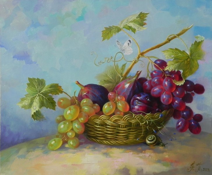 “Summer Day” is a luminous and serene still life. A handwoven basket overflows with ripe grapes, figs, and plums — bathed in soft sunlight and surrounded by glistening green leaves, a curious snail, and a fluttering white butterfly. This painting brings a timeless elegance and calm to any interior.