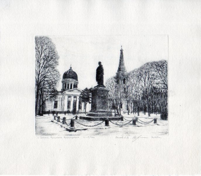 Winterlandschaft. Ein Bild von einem der symbolträchtigsten Orte Odessas – dem Sobornaja-Platz. Das Werk ist in strenger Technik ausgeführt, was ihm historische Tiefe und Monumentalität verleiht. Im Zentrum der Komposition erhebt sich majestätisch ein Denkmal für Graf Woronzow auf einem hohen, massiven Sockel, umgeben von einem niedrigen Geländer aus gusseisernen Sockeln, die durch schwere Ketten verbunden sind. Hinter dem Denkmal entfaltet sich ein majestätisches architektonisches Ensemble, das dem Platz seinen Namen gibt: Die Verklärungskathedrale: Die majestätische Kathedrale dominiert links mit ihrer klassischen Fassade und der massiven dunklen Kuppel. Die dichte Detaillierung unterstreicht die Monumentalität der Kirche. Rechts zeigt die Komposition einen hohen, schlanken Glockenturm mit spitzer Spitze. Seine vertikale Linie bildet ein Gegengewicht zu den horizontalen Linien der Kathedrale und verleiht der Komposition eine dynamische Balance. Die schwarz-weiße Detaillierung und die strenge Komposition verleihen dem Bild historische Bedeutung und lyrische Kontemplation.