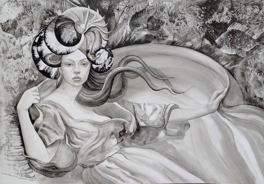 Die Melodie der Seele des Ozeans steigt aus seinen Tiefen auf. Sie ist wie das Echo uralten Wassers, wie eine längst vergessene, aber bis zum Zittern erkennbare Stimme. Die fantastische Meerjungfrau ist die Stimme des Wassers selbst, die ein Gesicht bekommen hat. Ihr Blick ist kein Spiegel, sondern eine Strömung: Er spiegelt sich nicht, sondern birgt eine Kraft, die mitreißen kann. Das Haar gleicht Seetang, und der Stoff des Kleides fließt wie eine salzige Dünung zwischen Traum und Wirklichkeit. Auf dem Kopf der Jungfrau befindet sich eine Muschel, ein Symbol der Geburt des Lebens und eine Mikrokopie des Universums, das den Regeln des Goldenen Schnitts unterliegt. Dies ist nicht nur ein Kopfschmuck – es ist eine Erinnerung, eng spiralförmig gewunden, so wie die Vergangenheit zu einem Ornament der Erfahrung verdreht ist. Sie ist nicht nur eine Frau: Sie ist ein Archetyp der Elemente, die Ruhe und Tiefe in sich trägt, aus denen Träume entstehen. Der Körper der Meerjungfrau ist Fleisch und Welle zugleich, die Grenze zwischen Festem und Flüssigem.