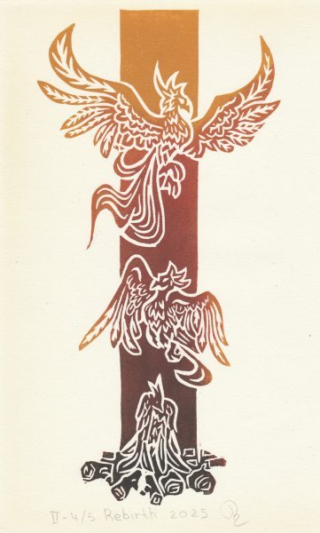 Dieser Linolschnitt symbolisiert den ewigen Kreislauf von Wandlung und Erneuerung durch das Bild des Phönix, der aus seiner Asche aufersteht. Die Farbverläufe von Dunkelbraun zu Goldorange spiegeln den Übergang von Zerstörung zu Wiedergeburt wider – vom Feuer zum Licht. Die Komposition fängt den Moment des Erwachens ein, in dem die Vergangenheit sich auflöst und neuer Kraft und neuem Leben Platz macht. Auflage: II–4/5 Technik: Handgedruckter Linolschnitt