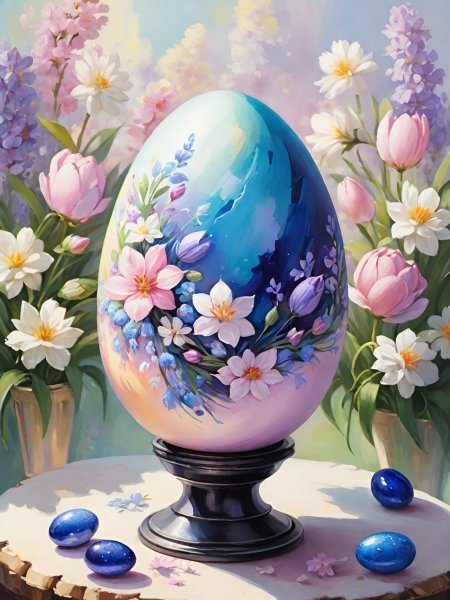 Esta cautivadora pieza evoca serenidad y gracia espiritual mediante su armoniosa combinación de suaves flores rosas y formas de vidrio translúcido. El delicado jarrón de porcelana y los motivos en forma de huevo simbolizan la renovación y la celebración, invitando al espectador a reflexionar sobre temas de pureza y belleza divina. La técnica CGI realza los intrincados detalles y la luminosidad del recipiente, creando una experiencia visual serena y edificante.