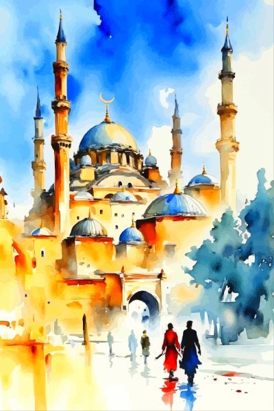 Título de la serie: “Mezquitas bajo la luz del verano”. Esta impresionante serie de pinturas digitales, Mezquitas bajo la luz del verano, captura la majestuosa belleza de la arquitectura islámica en días calurosos y soleados. El artista retrata con maestría mezquitas con imponentes minaretes y columnatas arqueadas que brillan bajo la intensa luz del sol. Con una paleta vibrante y pinceladas de estilo acuarela, cada pieza evoca la calidez y la quietud del verano en Oriente Medio. El objetivo del artista era reflejar la serenidad espiritual y cultural que se encuentra en los lugares sagrados, incluso en medio del bullicio de la vida urbana. Con cielos expresivos y tonos luminosos, las pinturas sumergen al espectador en un entorno onírico y realista. El reflejo de figuras y edificios sobre el pavimento iluminado por el sol añade profundidad y atmósfera. Esta serie es una poderosa expresión de luz, arquitectura y atmósfera. Atrae a coleccionistas que aprecian el arte de viajes, la cultura islámica y escenas ricas y evocadoras. Cada obra es un vibrante homenaje a la belleza atemporal y la calma espiritual.