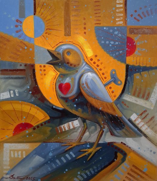 El canto de un pájaro mecánico. Mucho sol amarillo intenso y espacio gris azulado. Geometría y posteridad.