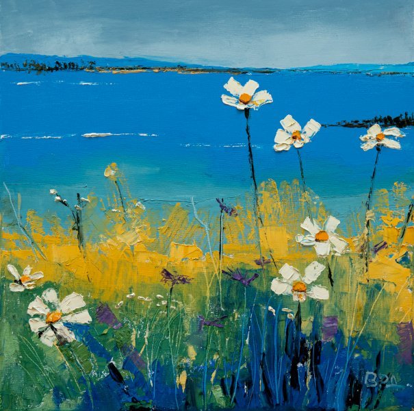 Las flores juegan un papel central en esta composición. Los tonos blancos evocan pureza y frescura, mientras que los toques de amarillo aportan calidez y luminosidad. Estos colores vibrantes resaltan sobre el fondo azul del mar, creando un efecto visual cautivador. Las flores, aunque inmóviles, casi parecen bailar con una ligera brisa. La paleta verde, por su parte, resalta la riqueza de la vegetación circundante, sumándose a la sensación de vida y energía que emana la obra. La composición de este lienzo está cuidadosamente estudiada. El formato cuadrado de 40x40 cm proporciona armonía visual, permitiendo que la mirada se mueva fácilmente a través de la escena. La colocación de los elementos, desde las flores en primer plano hasta las olas en el fondo, crea profundidad, invitando al espectador a sumergirse en este mundo sereno. Cada detalle, cada golpe del cuchillo, contribuye al equilibrio general de la obra, reforzando su impacto emocional.