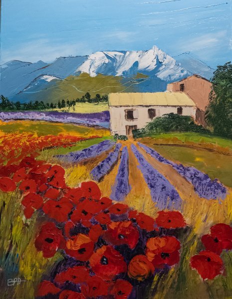 Una de las características más llamativas de esta obra es su vibrante paleta de colores. Las amapolas, cuyos vibrantes tonos rojos contrastan con los exuberantes verdes de los cipreses, están pintadas con tal intensidad que casi parecen bailar en el lienzo. Patrick Bauquel utiliza técnicas de cuchillo, que dan a los colores una textura dinámica que atrae la mirada. Esta elección de técnica permite la creación de capas y el juego con la luz, añadiendo una dimensión extra a la obra. Los colores brillantes no sólo son estéticamente agradables; También evocan las sensaciones y emociones vinculadas a la Provenza. Esta región, famosa por sus paisajes pintorescos y su luz dorada, está capturada con un fervor que transporta al espectador a un campo de flores de amapola, bañado por la luz del sol. Los tonos cálidos y vibrantes invitan al ensueño y la contemplación, recordando los dulces días de verano pasados en f