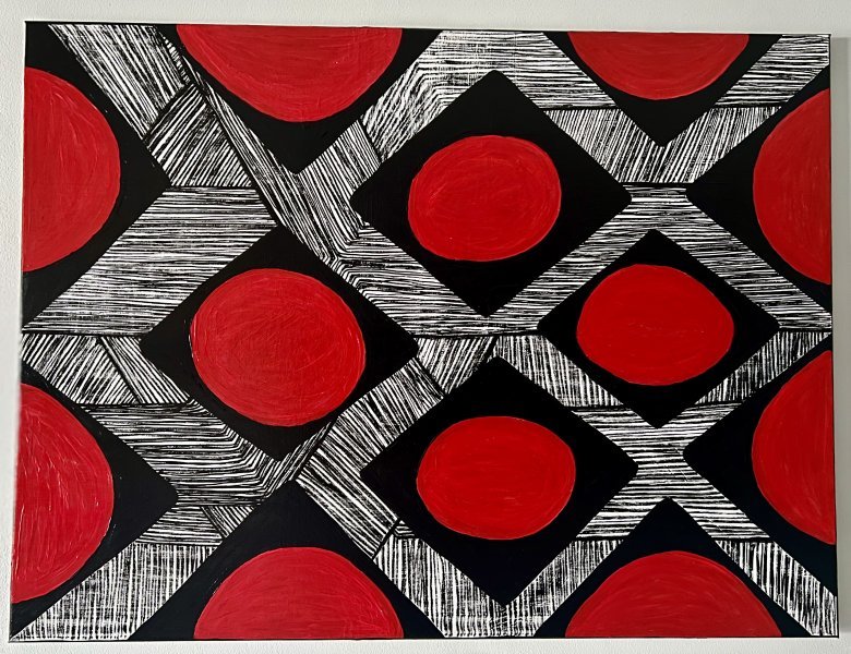En la profundidad de esta obra, los cursos de los ríos se entrelazan elegantemente con líneas geométricas de grafismo indígena, simbolizando unión y fluidez natural. Los círculos rojos vibrantes traen la presencia vital del sol, celebrando la vida y los rituales indígenas. Una rica paleta de colores y detalles cuidadosos invitan al espectador a una experiencia visual y sensorial, reflejando la profunda conexión entre la cultura y la naturaleza.