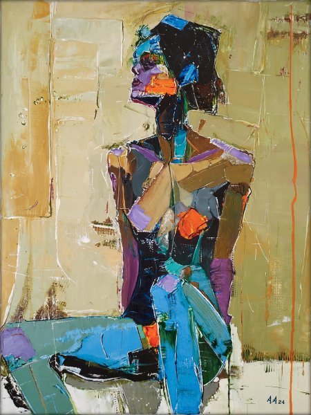 "Malachite Intonation" is a striking painting that portrays a seated female figure, created with a vibrant palette of colors. The woman’s form is composed of angular, abstract shapes, blending hues of blues, purples, oranges, and greens. Her posture suggests a sense of contemplation or introspection, as she gazes upward with a strong profile. The background is textured with earthy tones, contrasting with the vivid colors of the figure, enhancing the overall composition. The interplay of light and shadow, along with the fragmented brushstrokes, gives the piece a dynamic yet harmonious quality, capturing the viewer’s attention with its bold expression. Original work created by Alexander Aksyonov. The dimensions of the painting are W18 x H24 x D0.7 inches. High quality acrylic paints used, Light matte varnish protection applied.