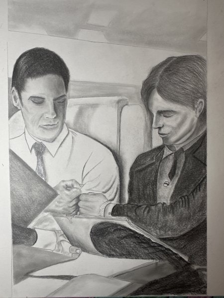 Le Dr Spencer Reid et Aaron Hotchner sont assis côte à côte dans la pénombre de la cabine du jet BAU. L'un, tout en angles vifs et en intelligence éveillée, l'autre, sculpté dans le granit, au regard attentif. Leurs mains se rencontrent au milieu de l'image : leurs jointures se touchent en un poing silencieux, un pacte scellé dans la poussière de graphite.