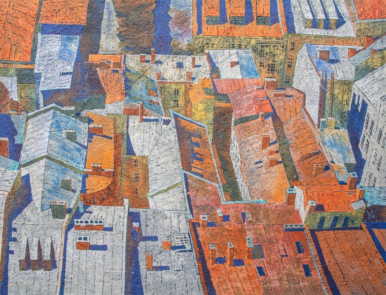 Cette œuvre conceptuelle de Sergio Kovalov, créée en 2025, utilise des éléments de puzzles et des motifs en mosaïque. L'œuvre incarne un mélange de textures et une esthétique rétro grunge, inspirée des influences architecturales de Lviv, en Ukraine. Peinte avec des matériaux de haute qualité, elle exprime la surface rugueuse et riche que l'on retrouve couramment dans les paysages urbains.