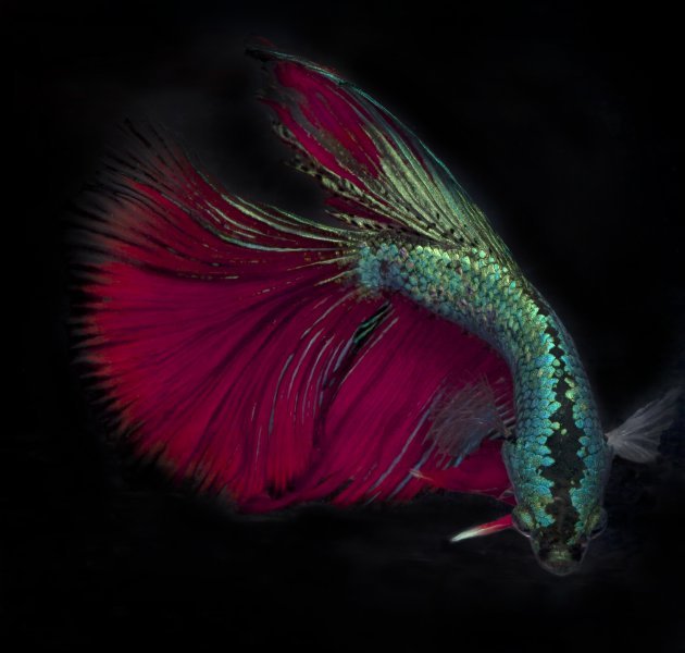 Cette photographie couleur représente un poisson betta mâle nageant sur un fond noir, mettant en valeur les détails saisissants et les formes dynamiques du sujet. Imprimée sur du papier d'art d'archive 300 g/m², l'image conserve une grande fidélité des couleurs et une grande netteté. Créée en 2017, cette impression capture la beauté naturelle grâce à un éclairage expert et à des techniques numériques, garantissant sa durabilité et son impact visuel.