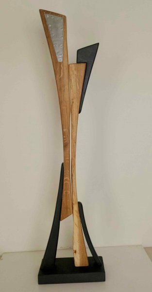 Cette sculpture passionnante mêle l'artisanat traditionnel du chêne avec des éléments modernes, créant un dialogue entre le naturel et l'artificiel. L'aspect brillant des parties métalliques contraste joliment avec la texture chaude et organique du bois. L’interprétation symbolique de l’œuvre invite le spectateur à explorer les différentes nuances du symbolisme, de l’abstraction et du rapport à la matière.