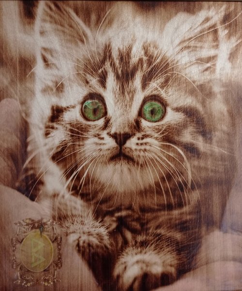 Berkana, un regalo per la Regina! Un quadro unico, il gattino è davvero vivo, Berkana è il nome del gattino e la runa della salute, basta immergersi nell'immagine e passare al positivo, questo è l'effetto del magnetismo animale. Come bonus, il retro con il timbro del maestro sarà una sorpresa per te. In generale, tutto è già visibile... Il dipinto è un giocattolo, un generatore di positività ed emozioni. Il dipinto è stato realizzato con una tecnologia mista, la pirografia (bruciatura su legno con nicromo rovente) ha realizzato l'immagine principale e ha dato vita al dipinto con l'acquerello. Sul retro c'è un timbro personale del maestro e un autografo. Il cavo d'acciaio sostiene un carico fino a 70 kg La cornice in alluminio crea un aspetto e un'estetica completi