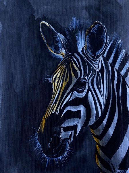 Quest'opera ritrae una zebra in modo drammatico ed elegante, su uno sfondo scuro che ne mette in risalto le strisce bianche e nere. Sottili accenti di blu e oro illuminano i contorni della testa, delle orecchie e del muso, creando l'impressione di un'aura luminosa. Lo sguardo della zebra è profondo ed enigmatico, trasmettendo un senso di nobiltà e mistero. Il dipinto cattura la pura bellezza del contrasto tra luce e ombra, fragilità e forza, trasformando questo animale in un simbolo di eleganza selvaggia.