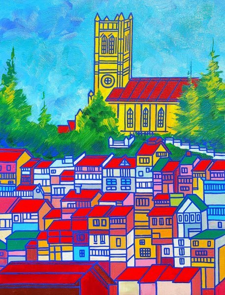 Questo dipinto cattura lo spirito vibrante di una storica cittadina di montagna attraverso una lente cubista, fondendo la solennità dell'architettura coloniale con il vivace mosaico di case colorate. I gialli brillanti della chiesa contrastano splendidamente con i sempreverdi circostanti, evocando sia tranquillità che profondità spirituale. I tetti stilizzati, resi in un motivo geometrico ritmico, trasmettono il caos armonioso della vita comunitaria. L'interazione di linee nette e colori vivaci crea una scena dinamica che celebra tradizione, cultura e bellezza naturale, invitando gli spettatori a esplorare le storie stratificate racchiuse in questo paesaggio urbano.