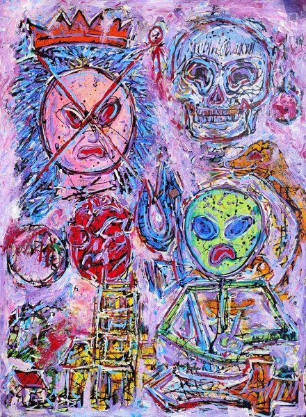 Questa potente opera d'arte in acrilico cattura il profondo paesaggio emotivo dell'alienazione e del tumulto interiore. Colori audaci si scontrano e si fondono, esprimendo conflitti esistenziali e forti emozioni. Le figure simboliche centrali, tra cui un personaggio incoronato contrassegnato da una X e una forma aliena ultraterrena, trasmettono un senso di rifiuto e di sradicamento. Le caotiche strutture a griglia evocano pensieri confusi e alienazione sociale, invitando l'osservatore a riflettere sull'identità, sulla mortalità e sulla lotta per la comprensione di sé.