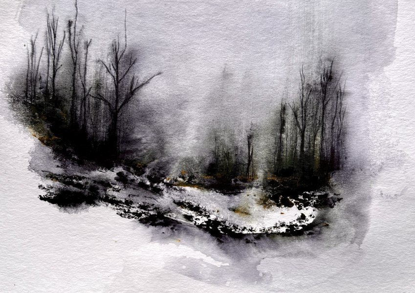Quest'opera è realizzata ad acquerello su carta, utilizzando pennellate delicate per catturare l'atmosfera eterea di una foresta al crepuscolo. Eseguita nel 2025, l'opera appartiene allo stile postimpressionista, evidenziando un paesaggio nebbioso e misterioso. L'artista fonde abilmente sfumature morbide e strati traslucidi per evocare un senso di mistero e profondità nella composizione.