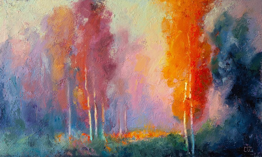 This painting belongs to my ongoing forest series, where I explore how light, color, and atmosphere can transform familiar woodland scenes into something almost dreamlike. Here, glowing amber and crimson trees emerge from a veil of cool violet and soft pink mist. I wanted to capture that fleeting moment when the forest seems to burn with light yet remains quiet and ethereal. Built with bold, textured oil strokes on hardboard mounted on a wooden stretcher (30 × 50 × 1.5 cm), the surface carries a rich, tactile presence. The contrast of fiery warmth and gentle haze invites the viewer to feel both the stillness and hidden energy of the woods.