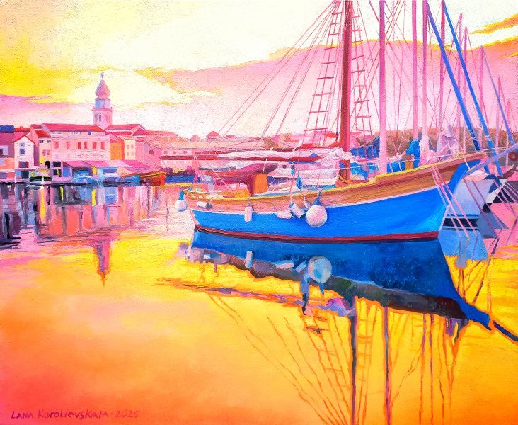 "Sera a Krk. L'oro della baia". Questo dipinto è come una lettera di viaggio: caldo, luminoso, scritto al tramonto. Sulla costa della città croata di Krk, una barca a vela riposa placidamente su un'acqua cristallina, riflettendo l'oro del cielo, un velo di rosa tenue e le luci scintillanti delle vecchie case. L'intera scena respira di silenzio e della quieta promessa di riposo. La tavolozza è costruita su un delicato equilibrio: dal blu intenso dello scafo della barca alle delicate tonalità di pesca, giallo, arancione e rosa del cielo. La baia sembra dissolversi nell'oro dell'estate, evocando quei rari momenti in cui il tempo rallenta e tutto intorno diventa più luminoso e vicino. Questa non è solo una vista di Krk, è uno stato d'animo: armonia serale, calore, una tenera malinconia e la sensazione di essere nel cuore dell'estate, e che l'estate sia dentro di te.