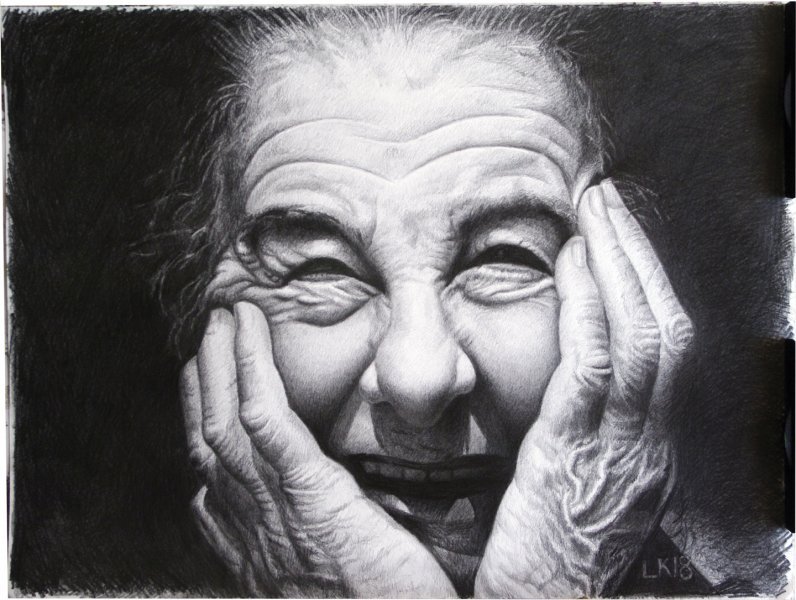 Questo dipinto è un bell'esempio di fotorealismo, che cattura la profondità delle emozioni e il carattere di un uomo maturo. L'artista trasmette magistralmente i tratti del viso di ogni individuo, svelando la storia della vita di Golda Meir attraverso il suo sguardo e la sua espressione. I dettagli resi meticolosamente creano l'impressione che il personaggio ritratto sia proprio di fronte a noi, offrendo allo spettatore un'opportunità unica di interagire con la storia e il tempo. Il film non solo dimostra padronanza tecnica, ma trasmette anche in modo meraviglioso il calore e la dignità della generazione più anziana.