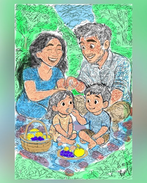 Plik cyfrowy do pobrania (PNG 5000x5000 px). Nie jest to oryginał fizyczny. Rodzinny piknik w ogrodzie — Rukhshona, Ali i ich dzieci Ciepły letni dzień, śmiech dzieci, aromat owoców i bezgraniczne szczęście… Narysowane ze szczególną miłością dla wszystkich, którzy cenią rodzinne ciepło ♡