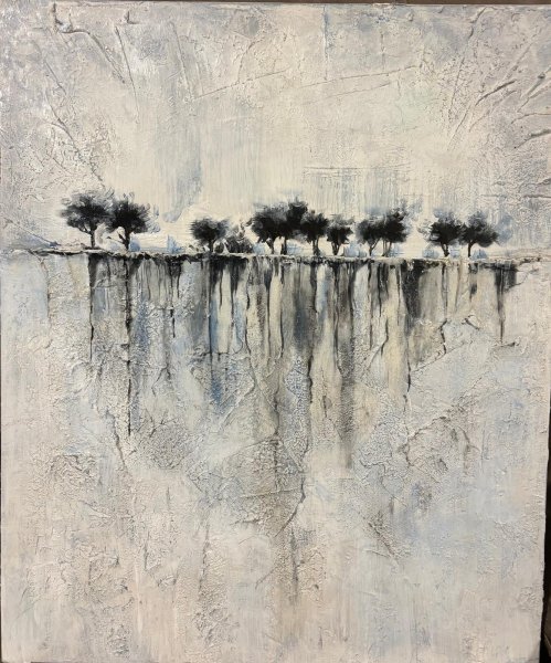 Ten obraz oddaje wyjątkowe poczucie zimowego spokoju i piękno zamrożonego świata. Wielowarstwowe faktury tworzą grę światła i cienia, podkreślając kruchość i majestat natury w chłodnej porze roku. Ośnieżone drzewa zdają się zastygnąć w czasie, a chłodne odcienie i ekspresyjne impastowe kompozycje przywołują na myśl ciszę i spokój. Dzieło łączy w sobie elementy nowoczesnej estetyki i art déco, podkreślając wdzięk i styl zimowego krajobrazu, który pozwala widzowi zanurzyć się w atmosferze mroźnej doskonałości.