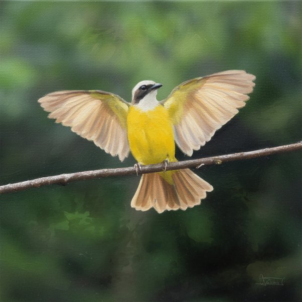 W tym dziele Orlando Sánchez Cabrera uchwycił delikatność i siłę zawartą w jednym naturalnym geście: precyzyjnym momencie, gdy żółto upierzony ptak rozpościera skrzydła, siedząc na gałęzi na głębokim zielonym tle, przywodzącym na myśl ciszę lasu. Praca łączy fotograficzną precyzję z malarską wrażliwością, osiągając równowagę między rzeczywistością a interpretacją. Zastosowana przez artystę cyfrowa obróbka zmiękcza kontury i nadaje fakturę przypominającą pociągnięcia pędzla olejnego, jednocześnie podkreślając świetlistość upierzenia i transparentność ruchu. Poza formalnym pięknem, „Wings of Light” zachęca do refleksji nad wolnością, kruchością i harmonią między naturą a sztuką. Skoncentrowana i symetryczna kompozycja emanuje jednocześnie spokojem i energią życiową. Wyobraź sobie to dzieło w swojej własnej przestrzeni – biurze, pracowni, salonie, jadalni czy sypialni – wnosząc poczucie spokoju, inspiracji i kontaktu z naturą.