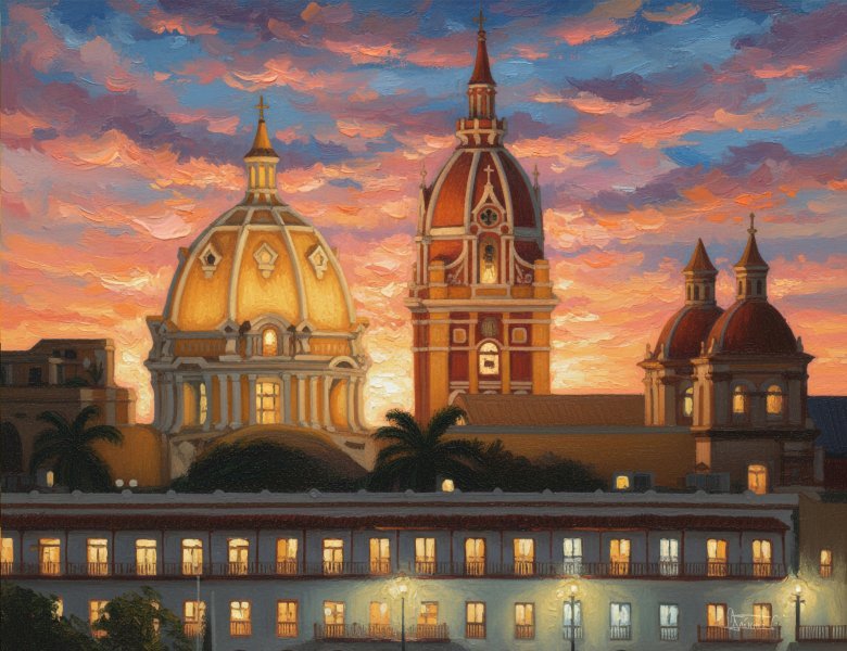 W „Katedrze o zachodzie słońca” Orlando Sánchez Cabrera przedstawia świetlistą i głęboko sugestywną wizję serca karaibskiego dziedzictwa Kolumbii: ikonicznych kopuł katedry św. Katarzyny Aleksandryjskiej, znajdującej się na starówce Cartageny de Indias, jednego z najważniejszych kolonialnych klejnotów Ameryki Łacińskiej. Praca, stworzona na podstawie fotografii cyfrowej, poddanej malarskiej obróbce, naśladującej bogactwo farb olejnych, ukazuje niebo w pełnej chromatycznej eksplozji – różów, fioletów, pomarańczy i błękitów – spowijając barokowe i neoklasycystyczne kopuły złotym ciepłem. Zachodzące światło podkreśla linie, reliefy i architektoniczną monumentalność historycznego centrum, a oświetlone kolonialne balkony w oddali przywołują tętniące życiem miasto otoczone murami. Praca wpisuje się w nurt współczesnego realizmu malarskiego, stylu łączącego fotografię ze sztukami plastycznymi.