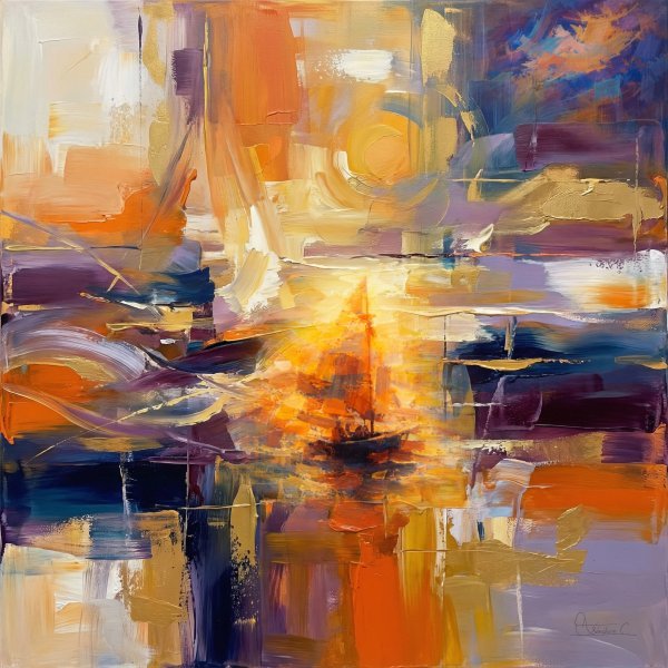 „Oś światła” stanowi spokojny punkt centralny w abstrakcyjnym i dynamicznym otoczeniu. Z rozpływającej się atmosfery wyłania się kształt żaglówki, uformowany cyfrowymi pociągnięciami pędzla, które bawią się światłem i cieniem. Ta świetlista abstrakcja ukazuje sugestywny krajobraz o ciepłych tonach i eterycznej atmosferze. To współczesne dzieło sztuki to wydruk giclée, który podkreśla malarską fakturę i efekt malarstwa olejnego. Cyfrowe techniki zastosowane przez artystę na płótnie i papierze tworzą poetycką kompozycję z luźnymi pociągnięciami pędzla. Duży, kwadratowy format stanowi śmiałe przesłanie. Dzieło wykorzystuje złote światło, aby nadać strukturę przestrzeni emocjonalnej. Zachęca widzów do odnalezienia własnego punktu zaczepienia w swojej abstrakcyjnej sztuce. Tematem jest samo światło, zarówno oświetlające, jak i tworzące formę. Idealne dla osób poszukujących odrobiny abstrakcyjnego piękna, dzieło to wnosi poczucie spokoju i kontemplacji do każdego pomieszczenia.