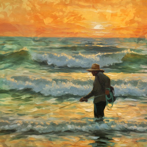 „Rybak o świcie” to głęboko poetycki obraz, który uchwycił moment, gdy złote światło słońca łączy się z pluskiem fal. Wykorzystując cyfrową manipulację, naśladującą tradycyjne malarstwo olejne, artysta osiągnął idealne połączenie fotografii i malarstwa, podkreślając fakturę fal i podświetlenie otaczające samotnego rybaka. Odcienie pomarańczu i turkusu przeplatają się w chromatycznej równowadze, która wyraża spokój, wysiłek i kontemplację. To dzieło, będące czymś więcej niż obrazem, jest refleksją nad intymną relacją między człowiekiem a morzem, rutyną i nadzieją. Idealne do przestrzeni, w których poszukuje się inspiracji i spokoju – pracowni, biura lub dobrze oświetlonego salonu – dzieło to zaprasza widza do poczucia bryzy, szumu fal i ciepła świtu.