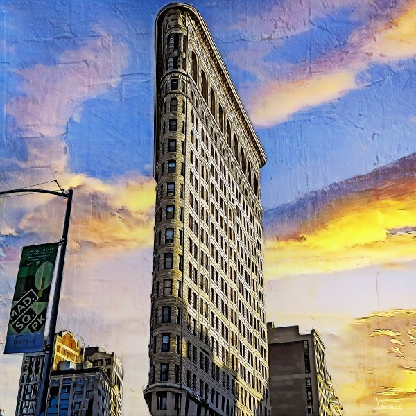 To fotoimpresjonistyczne dzieło sztuki powstało w 2025 roku. Wykorzystuje ono techniki druku cyfrowego, aby uchwycić magię kultowej architektury Nowego Jorku. Trójkątna konstrukcja Flatiron wyróżnia się w złotym świetle zachodzącego słońca, stając się symbolem miasta. Charakteryzuje się połączeniem żywych kolorów, które kontrastują z estetyką architektoniczną, zachęcając do zastanowienia się nad trwałością konstrukcji mimo upływu czasu. Dzieło jest certyfikowane przez artystę Orlando Sancheza.