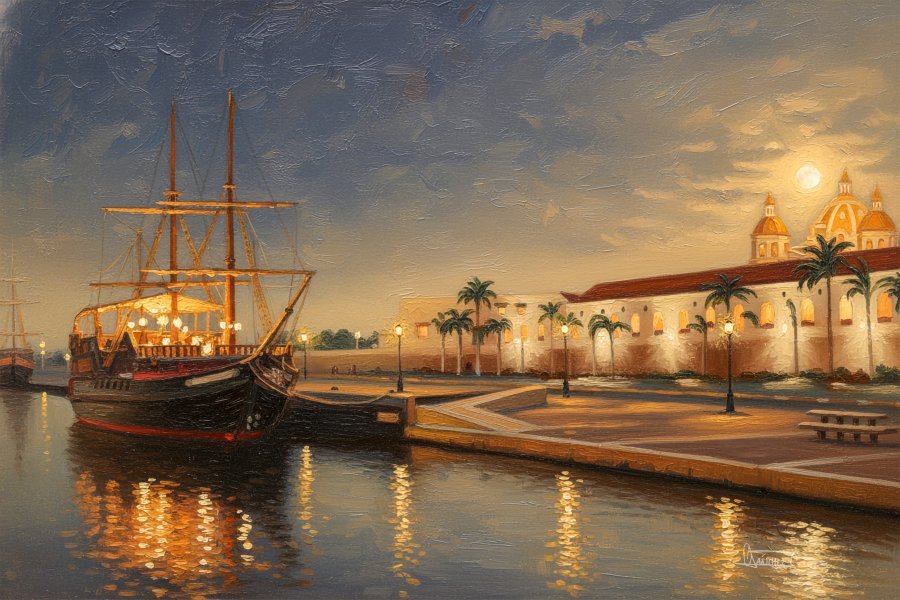 Ten cyfrowy obraz ukazuje magiczny spokój molo Pegasos w nocnym świetle, gdzie stary galeon staje się świetlistym i sugestywnym punktem centralnym sceny. Połączenie złotych i błękitnych refleksów przywołuje karaibski spokój i podkreśla historyczną wspaniałość Cartageny, odzwierciedlając wzajemne oddziaływanie kolonialnego dziedzictwa architektonicznego z tętniącą życiem atmosferą wybrzeża. Dzieło zaprasza widza w wizualną podróż, która łączy klasycyzm tradycyjnego malarstwa ze świeżością współczesnej sztuki cyfrowej, rozbudzając emocje związane z dziedzictwem i nocnym pięknem kolumbijskich Karaibów.