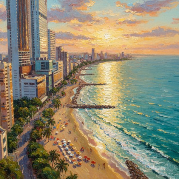 Ten nastrojowy, realistyczny obraz z impresjonistycznymi akcentami ukazuje tętniącą życiem harmonię między naturą a życiem miejskim w nadmorskiej scenerii o zachodzie słońca. Kompozycja rozwija się ciepłą i otulającą paletą barw, gdzie złote odcienie nieba mieszają się z odbiciami na oceanie, tworząc świetlistą oś, która prowadzi wzrok od plaży do horyzontu. Kluczowe jest wykorzystanie światła: nowoczesne budynki rzucają długie cienie, które kontrastują z miękkością chmur, a palmy i parasole dodają wizualnego rytmu i poczucia ludzkiej skali. Postacie spacerujące wzdłuż brzegu, choć niewielkie, wnoszą życie i ruch do sceny, przywołując narrację kontemplacji i codziennej radości. Wyobraź sobie ten obraz w swojej własnej przestrzeni: w pokoju skąpanym w naturalnym świetle, w jadalni jako temat do rozmów, w biurze, które inspiruje do spokoju lub w sypialni przywołującej nadmorskie marzenia.