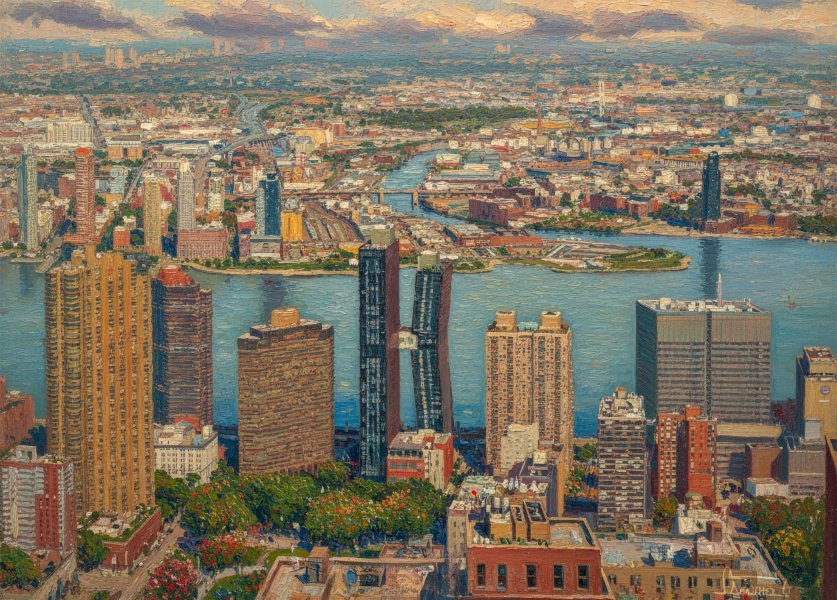 Ten obraz ukazuje tętniącą życiem istotę nowojorskiej metropolii, gdzie monumentalność wieżowców splata się ze spokojem East River. Impresjonistyczne faktury nadają miejskiemu krajobrazowi wrażenie ruchu i życia, a szczegółowy realizm podkreśla złożoność architektury i gęstość miasta. Interakcja wody z budynkami tworzy wizualny rytm, który zachęca do refleksji zarówno nad konstruktywną siłą, jak i spokojem, jaki oferuje natura pośród zgiełku miasta.
