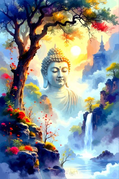 Эта картина прекрасно передает мистический восход солнца, освещающий безмятежную фигуру Будды, расположившуюся в эфирном ландшафте. Благодаря гармоничному сочетанию фантазии и духовного символизма она передает глубокий покой и духовное возвышение. Мягкое сияющее небо и спокойные горы вдохновляют на медитативное состояние, приглашая зрителей испытать спокойствие и внутреннее размышление. Эта работа выходит за рамки простого украшения, предлагая визуальное путешествие в гармоничную духовность и сказочную безмятежность.