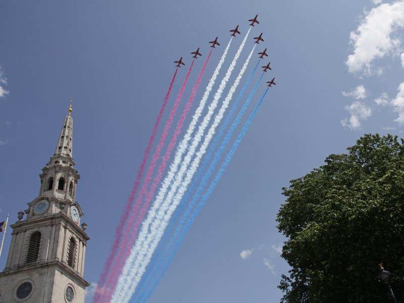 Это цветное фото сделано на Трюфельгальской площади в Англии во время парада, посвященного королевскому празднованию 2025 года. Изображены истребители Военно-воздушных сил Англии, демонстрирующие свою мощь и красоту в небе. Фото создано с акцентом на динамику и живость момента, подчеркнутую яркой цветовой палитрой. Работа выполнена в жанре репортажа и передает атмосферу торжества и военной дисциплины.