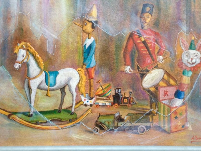 Ця картина виконана олійними фарбами на полотні, з використанням м'яких кольорів та глазурі для створення ніжного, прозорого ефекту. Датована 2015 роком, робота передає інтимну та ностальгічну атмосферу завдяки вибору матеріалів. Жорстка основа дозволяє точно передати деталі та видиму текстуру, а ніжні мазки пензля підкреслюють тему минулого часу. Роботу підписано художником Анджело Ферро.